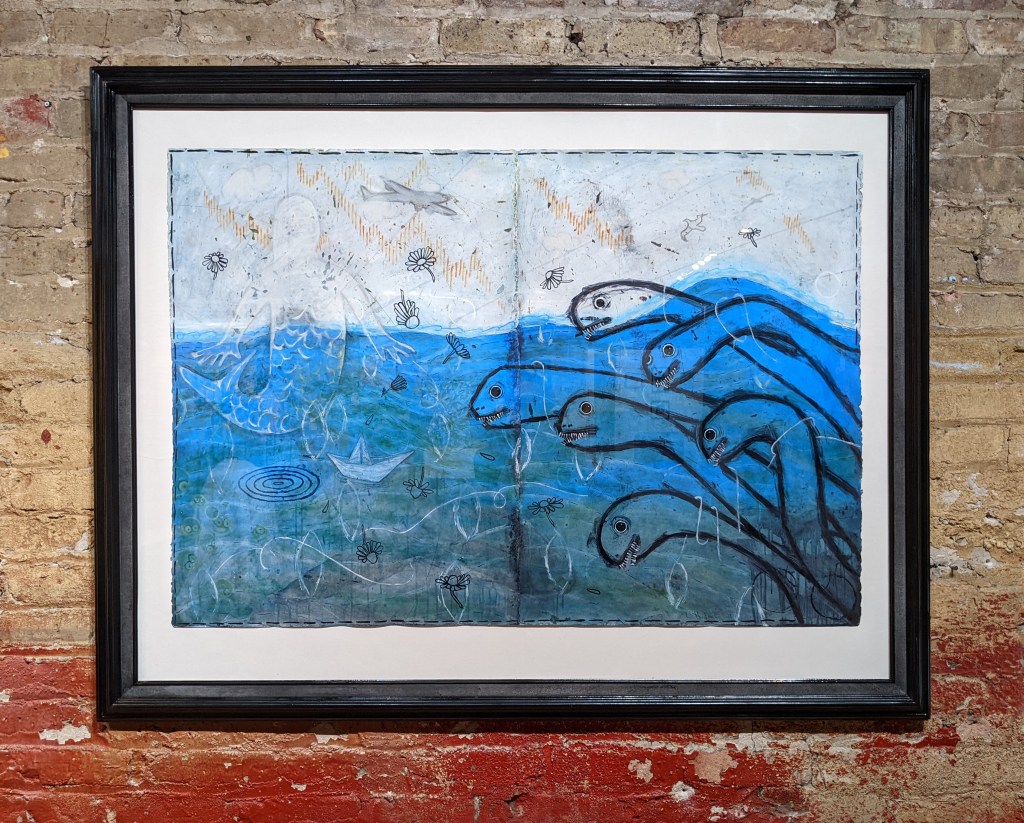 Anxiety is such a funny thing. It seems so overwhelming but when you consider it objectively it can be quite silly. In this painting, the seven-headed Scylla has broken the thin strings that failed to hold it at bay and appears eager to wreak havoc. To avoid Scylla one must navigate Charybdis, which sounds threatening but in this case is just a ripple aside a small paper boat. Orange lines in the sky could be the Northern Lights, or a swiftly declining stock market. Chamomile flowers float down from the heavens. A blue whale represents the undercurrent of calm that’s there if you just stop and breathe.