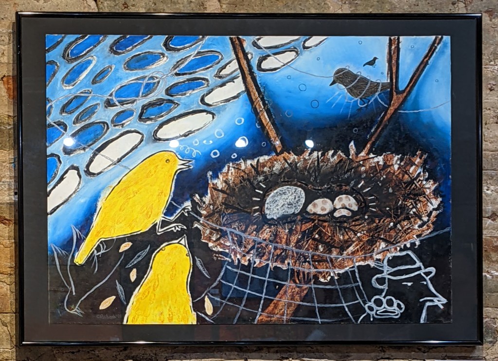 Brown-headed cowbirds are brood parasites. They lay their eggs in the nests of other birds, and those other birds raise the cowbird’s young – often at the expense of their own smaller chicks. Sometimes the hosts recognize the cowbird egg and remove it from their nest, to which cowbirds can respond with “mafia action” during which they destroy the host’s other eggs. In this painting, two yellow warblers are confused by the addition of a larger egg to their nest. A crude net is in place to catch any young that may fall. The female cowbird looks on from a distance and a male hovers in the background, while mafia action waits in the corner.