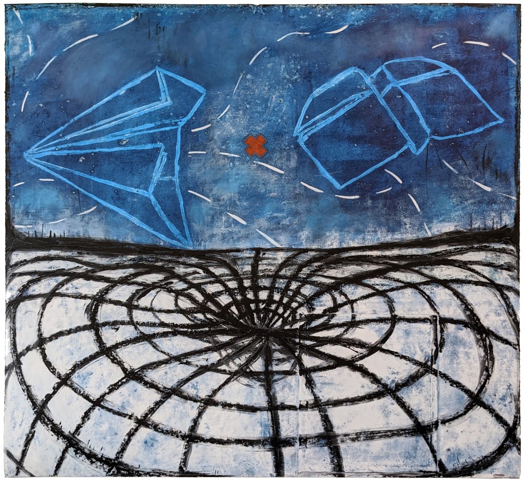 The inspiration for this painting was a couple of paper airplanes that I found near the elementary school by our house. Finding them made me happy – I could imagine the kids who made them laughing and showing off their paper airplane-making skills. Of course, the apparent simplicity of these toys belies the fact that they are affected by profound natural forces. Aren’t we a lot like paper airplanes? In this painting, the little paper airplanes defy the power of gravity as they create their own air currents and vortices, maybe missing their goal but having fun anyway.