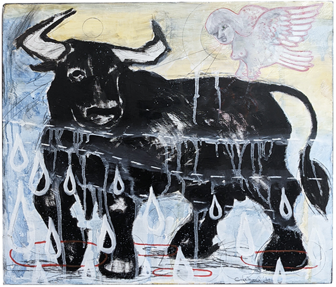 In this painting a bull is visited by a siren in the guise of an angel descended from heaven. The siren sings a song of wealth and power so alluring that the bull is drawn in and begins to imagine himself as a god. He knows he can “make it rain” and the money will flow in like water – but ultimately the water will rise until it drowns him.