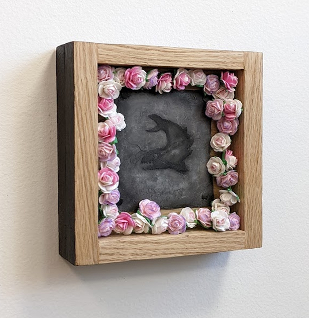 mixed media (intaglio print on lead, oak, fabric flowers)