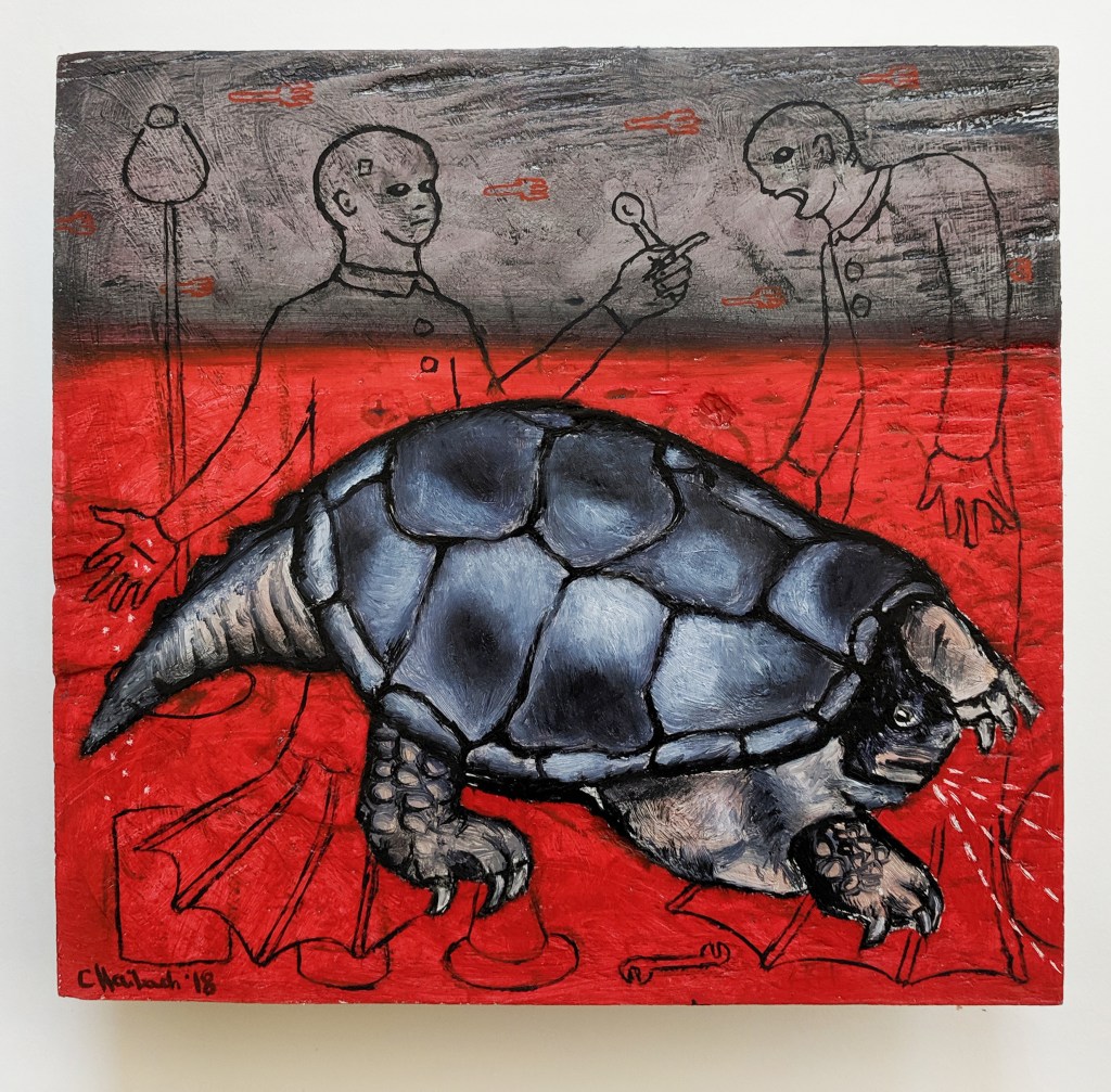 This is a painting of an enormous snapping turtle that I saw on a visit to a prairie one hot summer day. My mom used to love eating snapping turtle soup, so I guess I was thinking about that while doodling on the background. Eating snapping turtles seems very alien to me – I guess that’s where the aliens came from. I really have no idea about the rest of it.